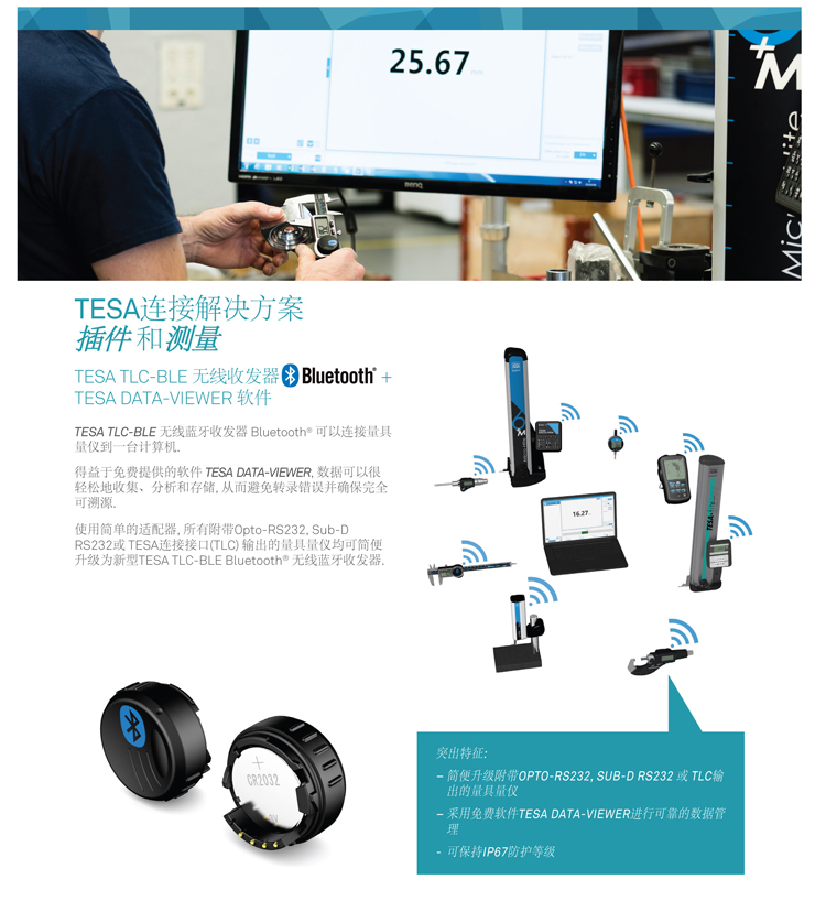 任何帶有 Opto-RS232, Sub-D RS232 或 TLC 輸出的量具量儀均可使用TESA連接解決方案輕松升級.