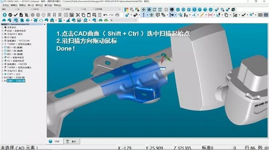 現在,PC-DMIS Laser也支持激光傳感器的快速掃描功能。點擊CAD曲面拖曳鼠標,即可完成掃描特征的創建。