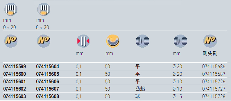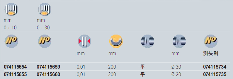 訂貨號 | 訂貨號 | 量程mm | 分度值mm | 測量面 | 測量面 直徑mm | |