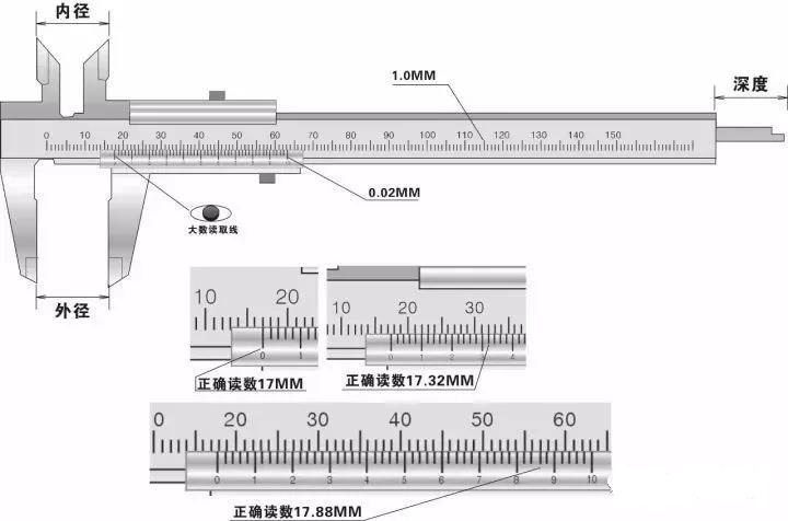 圖示,系精度為0.02mm的卡尺,其主尺上的每一小格是1mm,每一大格是10 mm;副尺上是把9 mm的長度等分為10格,每小格為9/10 mm。主、副尺每格相差0.1 mm。